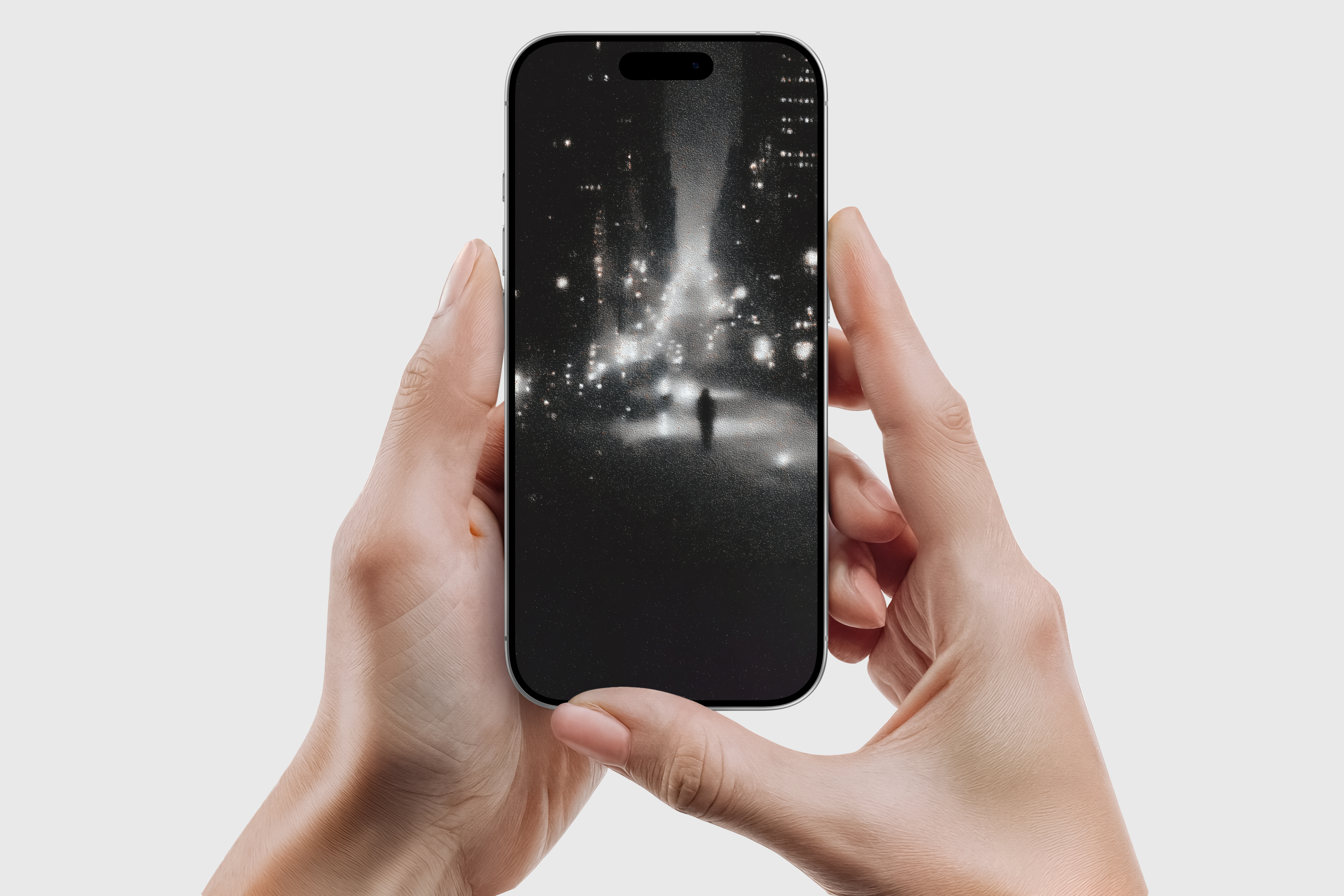 Lone silhouette lost in glowing city fog at night. Cinematic bokeh, dark moody urban vibes. A stunning dark aesthetic wallpaper. Perfect for AMOLED & dark screens.