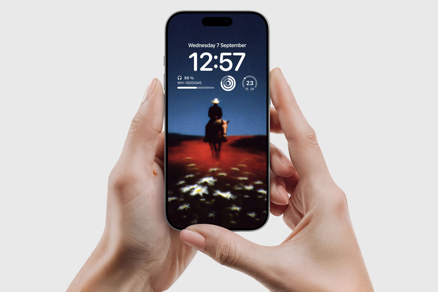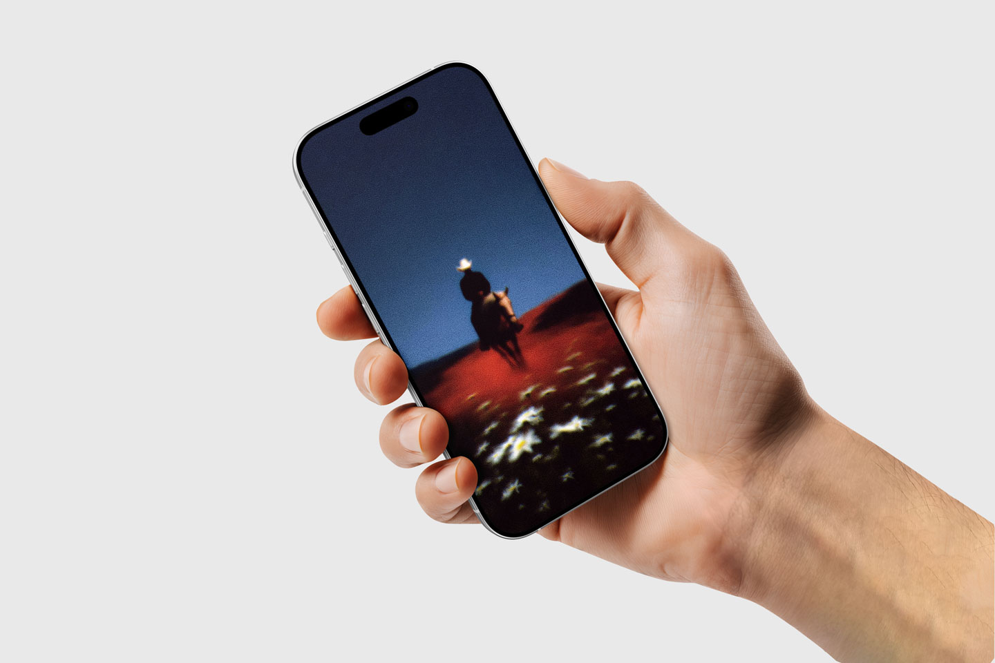 Dreamy cowboy on horseback riding into the horizon. Red earth, white daisies & deep blue sky with grainy film aesthetic. Perfect dark moody wallpaper for phone